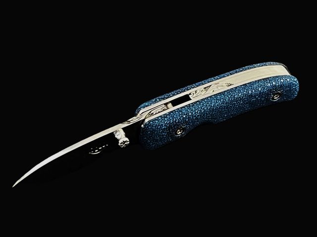 Petit couteau pliant de type liner lock, plaquettes en peau de raie et lame en acier inoxydable N690Co Böhler. Un vrai petit bijou !