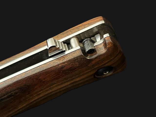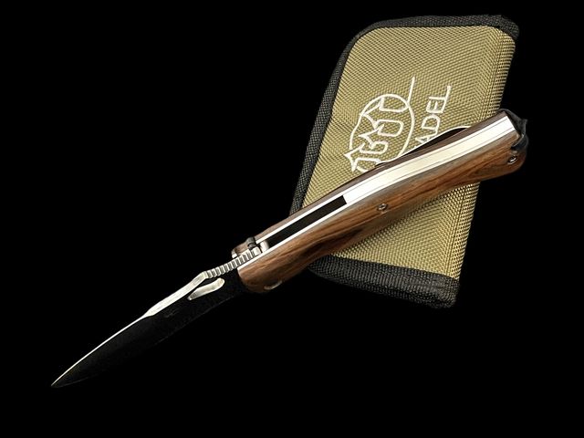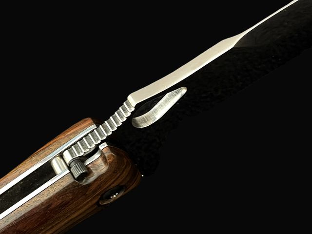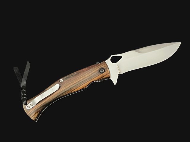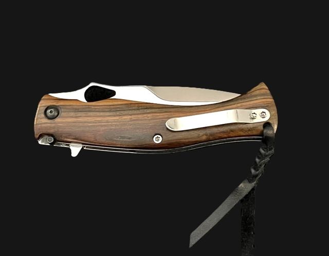 - Plaquettes en rosewood, platines en acier inoxydable comprenant un ressort cranté, levier de sécurité (brevet Ron Lake) en plus du liner lock, clip de poche et lanière en cuir tressé.