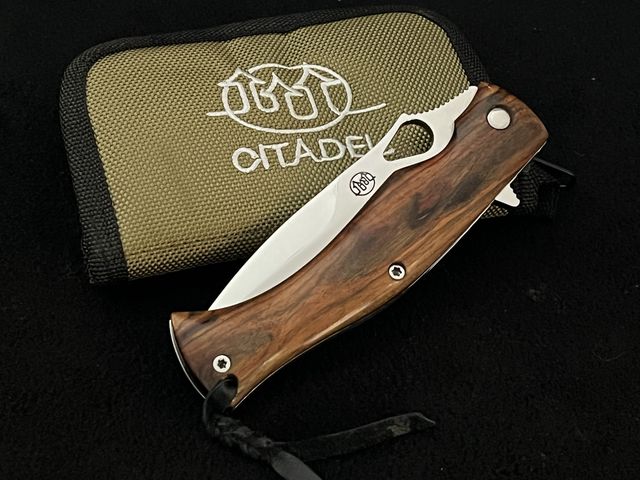 - Lame polie, contre-tranchant non aiguisé, repose pouce cranté et thumbhole en forme de goutte sur la lame. Longueur 114mm, largeur 30mm, épaisseur 4mm.