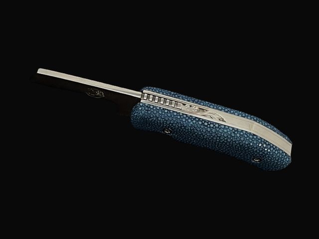 - Manche en acier inoxydable Z40C13, plaquettes démontables en peau de raie, dos ciselé main. Épaisseur 21mm et largeur 23mm.