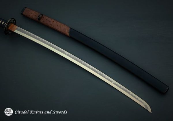 Le Katana “Inazuma” Citadel est un beau sabre, lame sans gorge a courbure moderée. Koshirae original et élégant. Saya laqué rehaussé de cuir d’autruche brun sombre. Pièce UNIQUE.