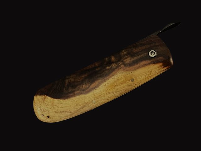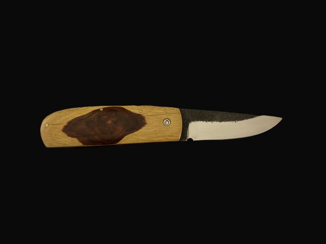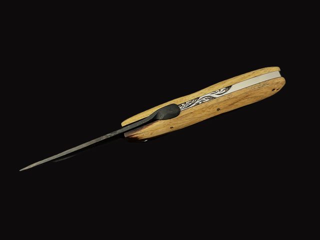 - Manche en bois, intercalaire en acier, dos ciselé à la main. Épaisseur 19mm et largeur au 30mm.