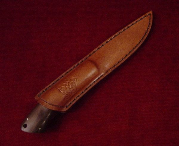 Couteau droit de chasse au manche en rosewood. Lame acier carbone XC75 forgée main et polie, avec ciselure partielle sur le dos. Prise en main très confortable et bon au travail !