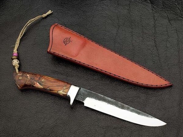 An outstanding hunting knife from Ciatdel with splendid stabilized beech wood scales maintained by 3 mosaic rivets. Hand forged 1075 carbon steel blade. Entirely handmade by CITADEL.