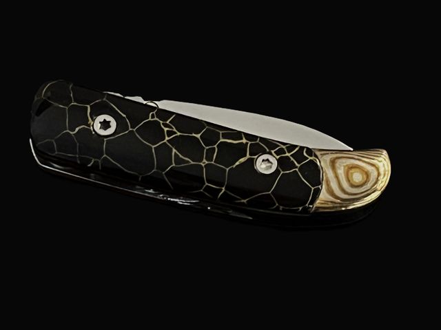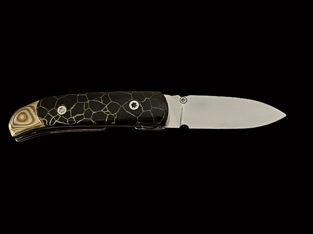 - Mirror blade with thumb stud, partly hand chiseled on spine, mounted on bronze-beryllium washers. Adjustable tightening. Length 60mm, thickness 3mm, width 19mm.