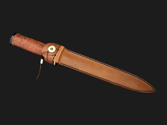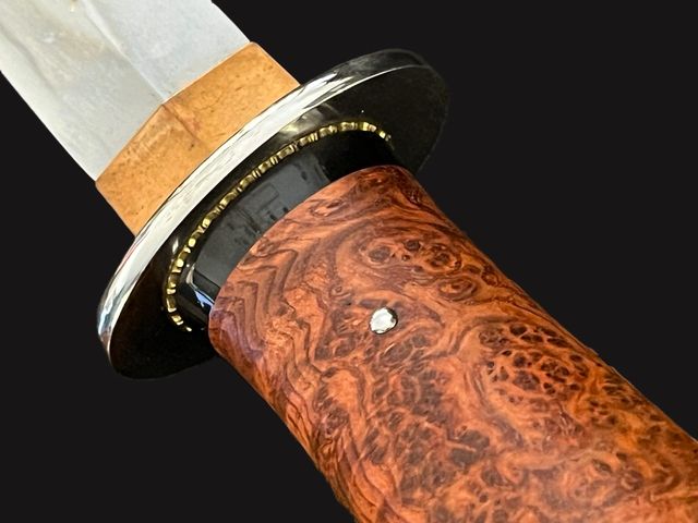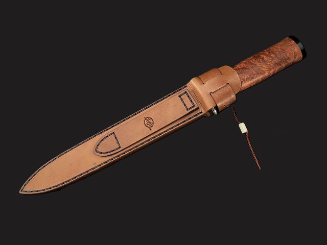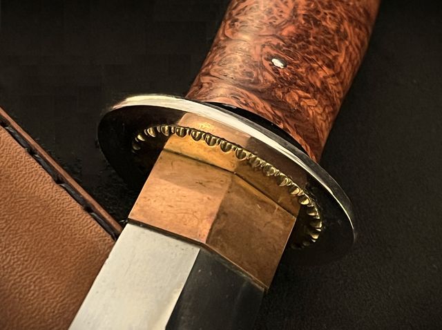 - Hidden tang handle is made of very nice stabilized maple burl wood, water buffalo horn bolsters and nickel silver peg. Thickness 23mm and width 34mm.