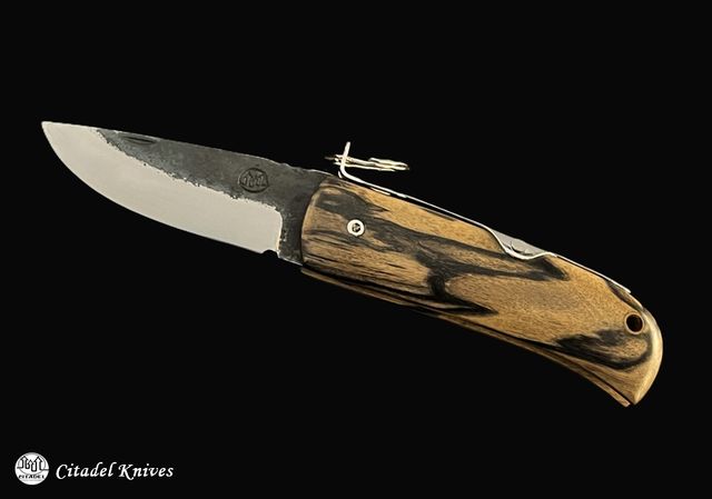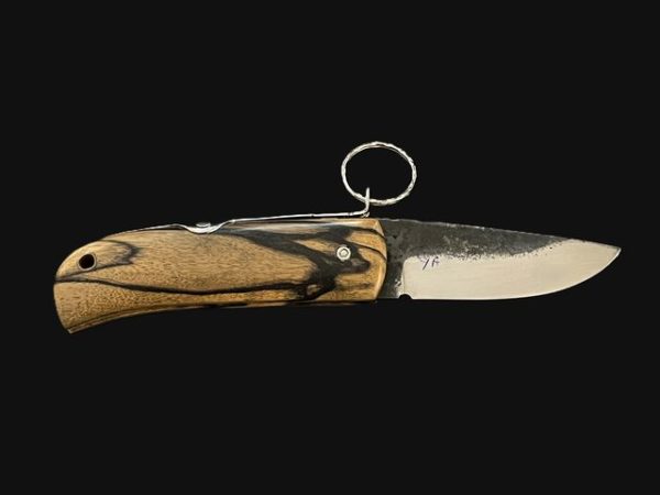 - Hand forged blade, 1075 carbon steel with true differential quenching, brut de forge have filework on spine. Length 83mm, thickness 3mm and width 29mm.