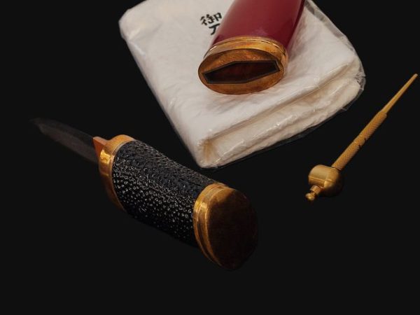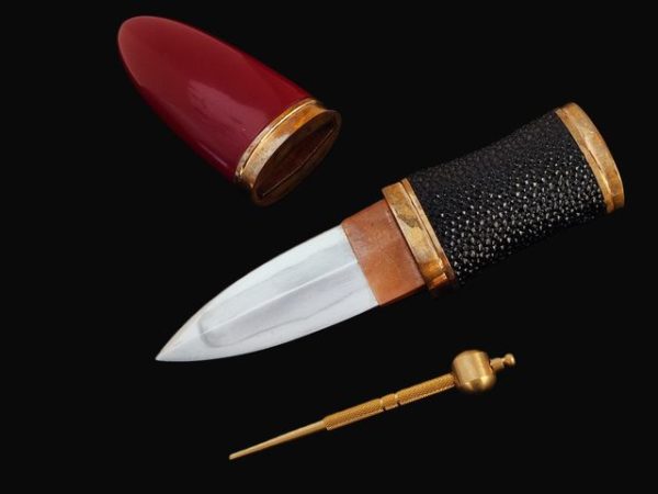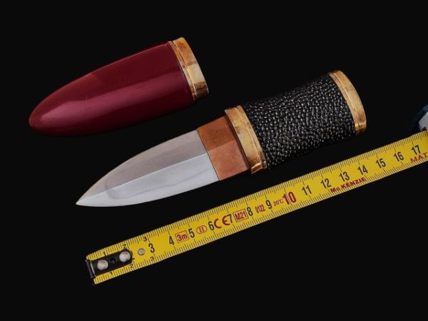- Hand-forged and polished 1075 carbon steel blade with central ridge, double edge, visible selective temper line (Hamon Midare), length 70mm, thickness 5mm, width 30mm. Tempered copper Habaki mounted on the blade.