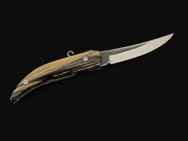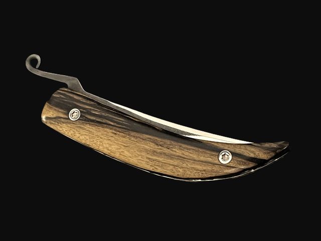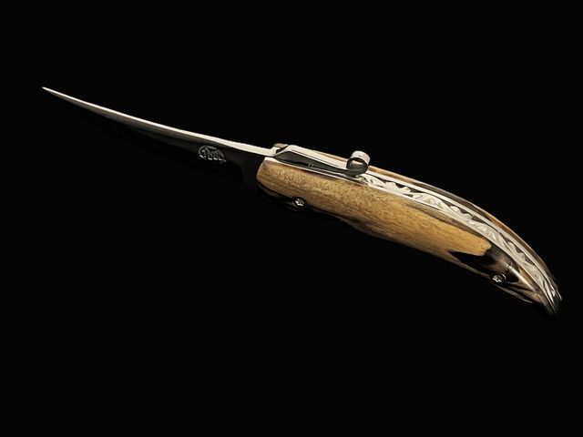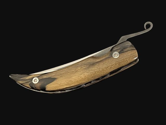 Beautiful pocket knife with piemontese lever for easy opening, liner lock system. N690Co- Böhler stainless steel blade with Laos royal ebony wood scales. Entirely handmade by CITADEL.
